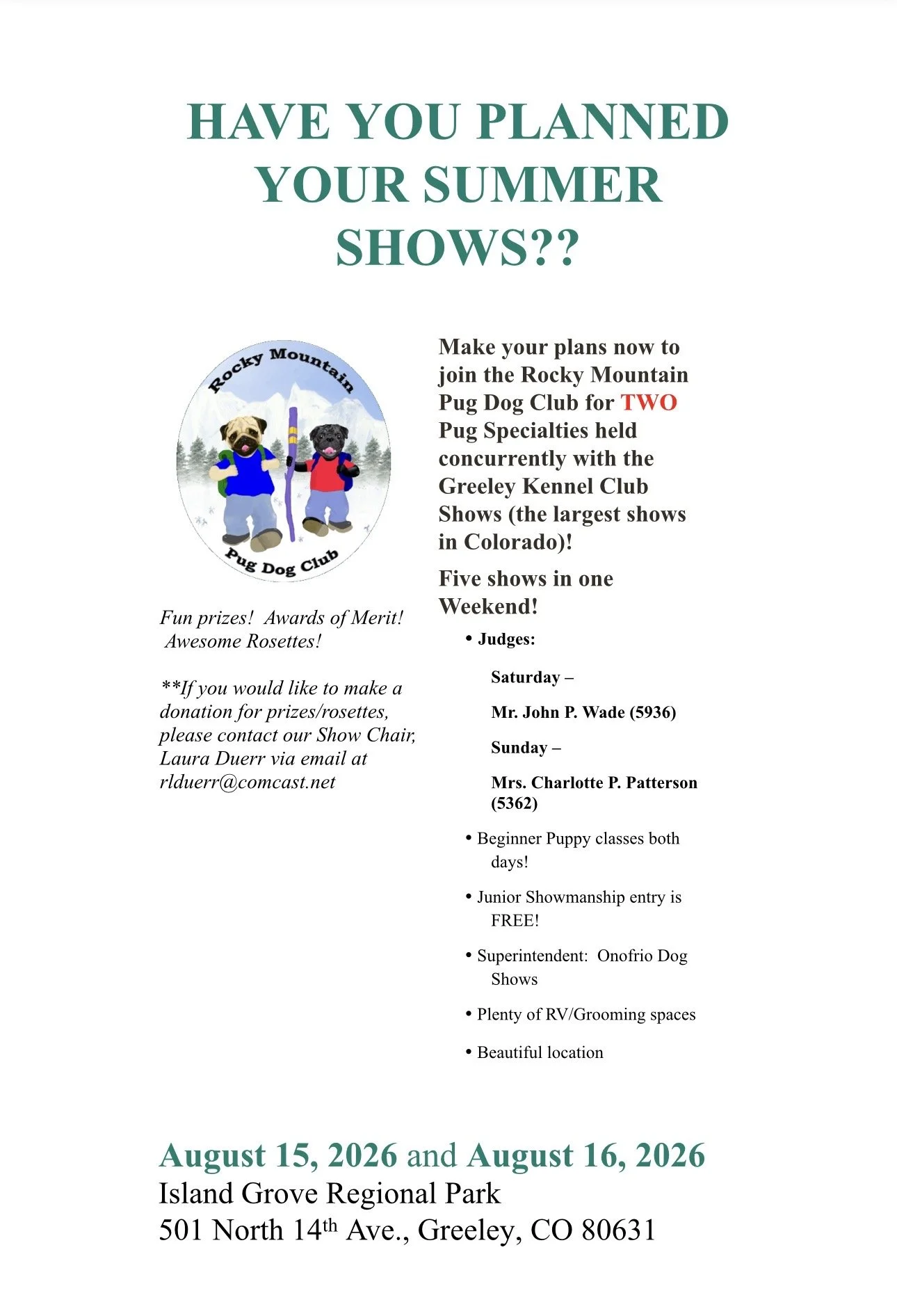 Check with your local clubs for their specialty dates! A full list of Clubs can be found here. Photo Credit: Carla Rose Are you an authorized representative for a PDCA Chapter Club? To have your club’s events and specialty information displayed on this page, send an email to: keatingbritt@gmail.com Rocky Mountain Pug ClubAugust 15th and 16th, 2026Download flyer